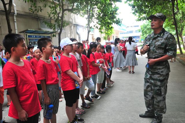 教官讲说军训纪律时小朋友们认真聆听