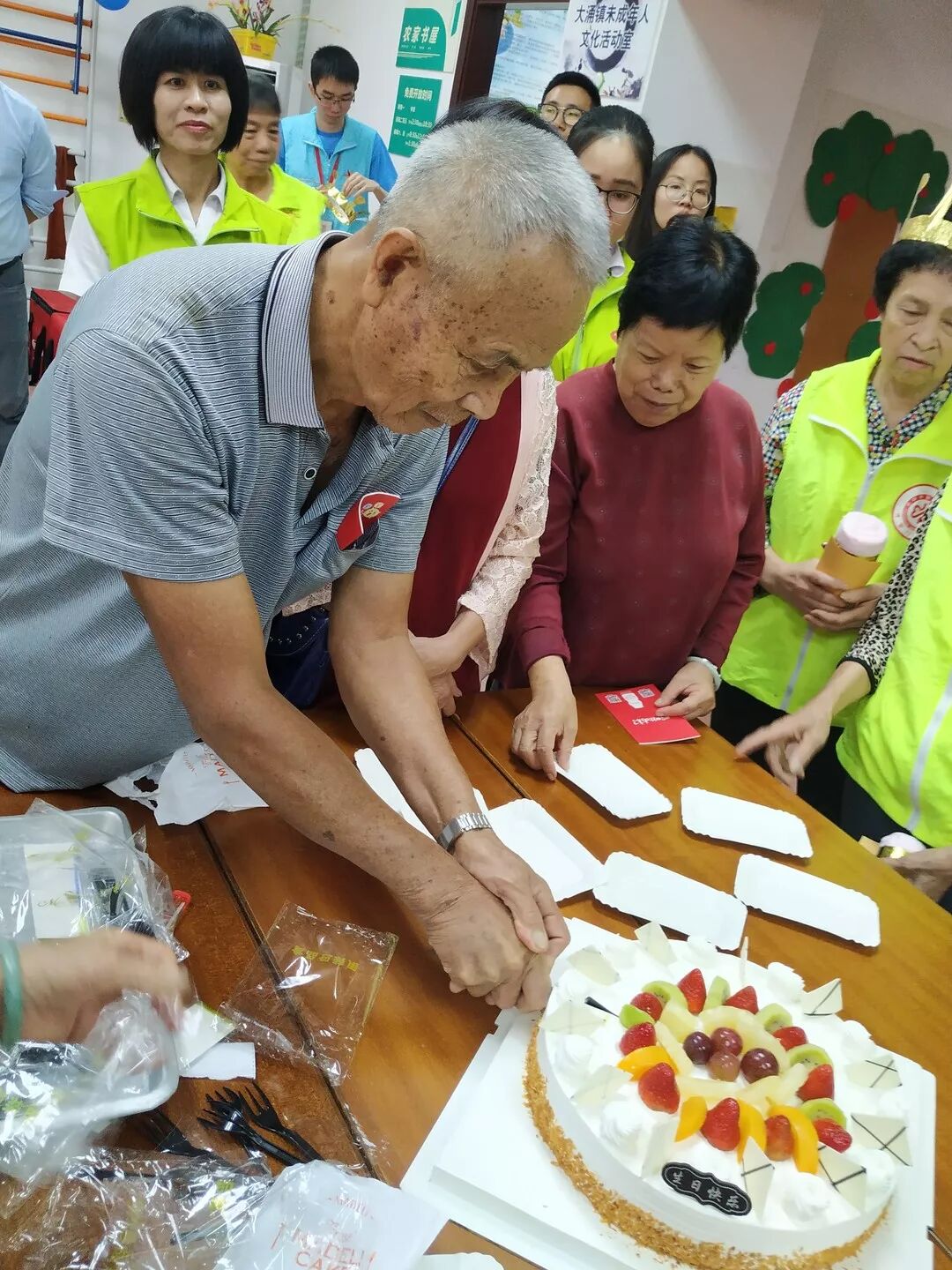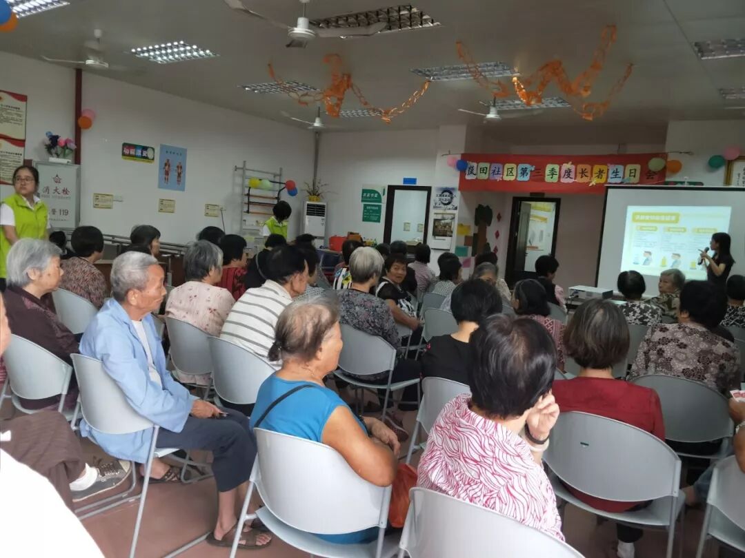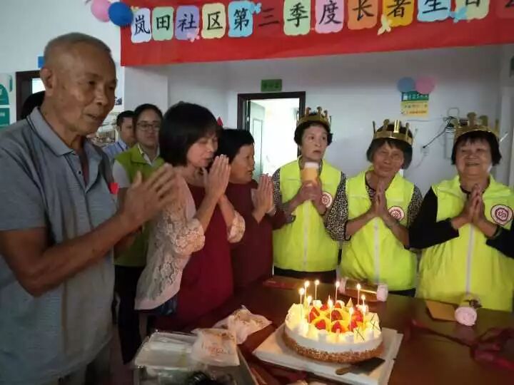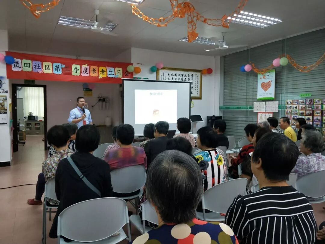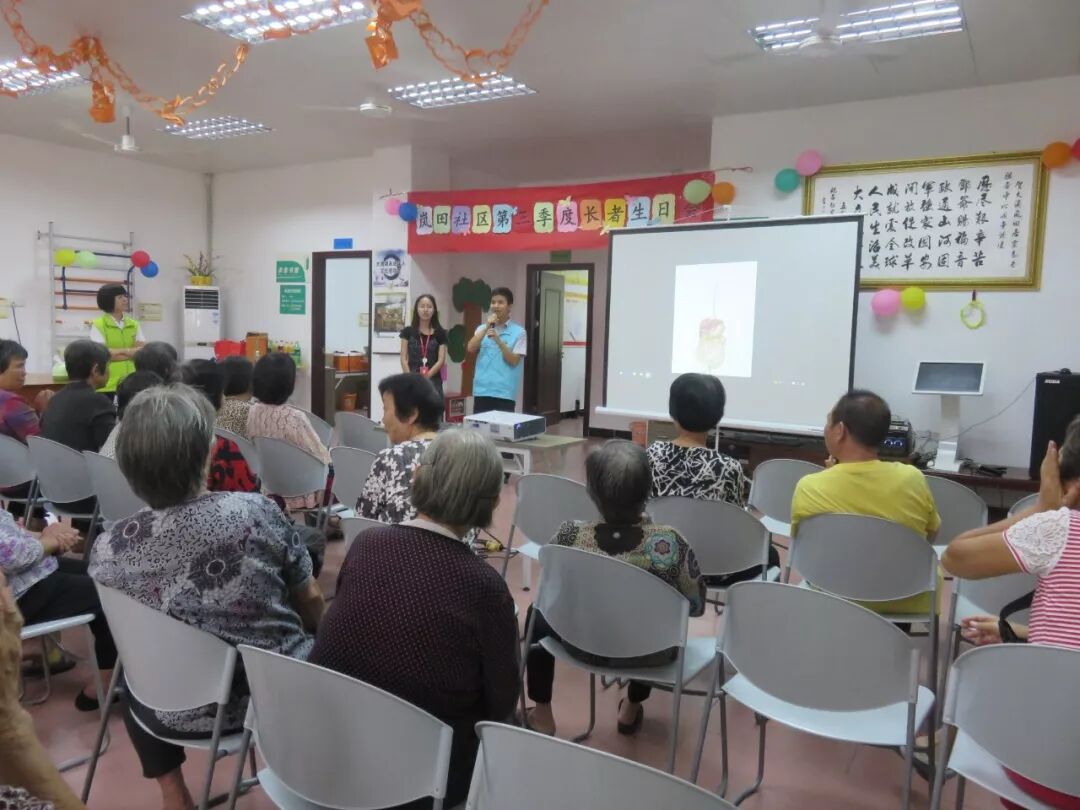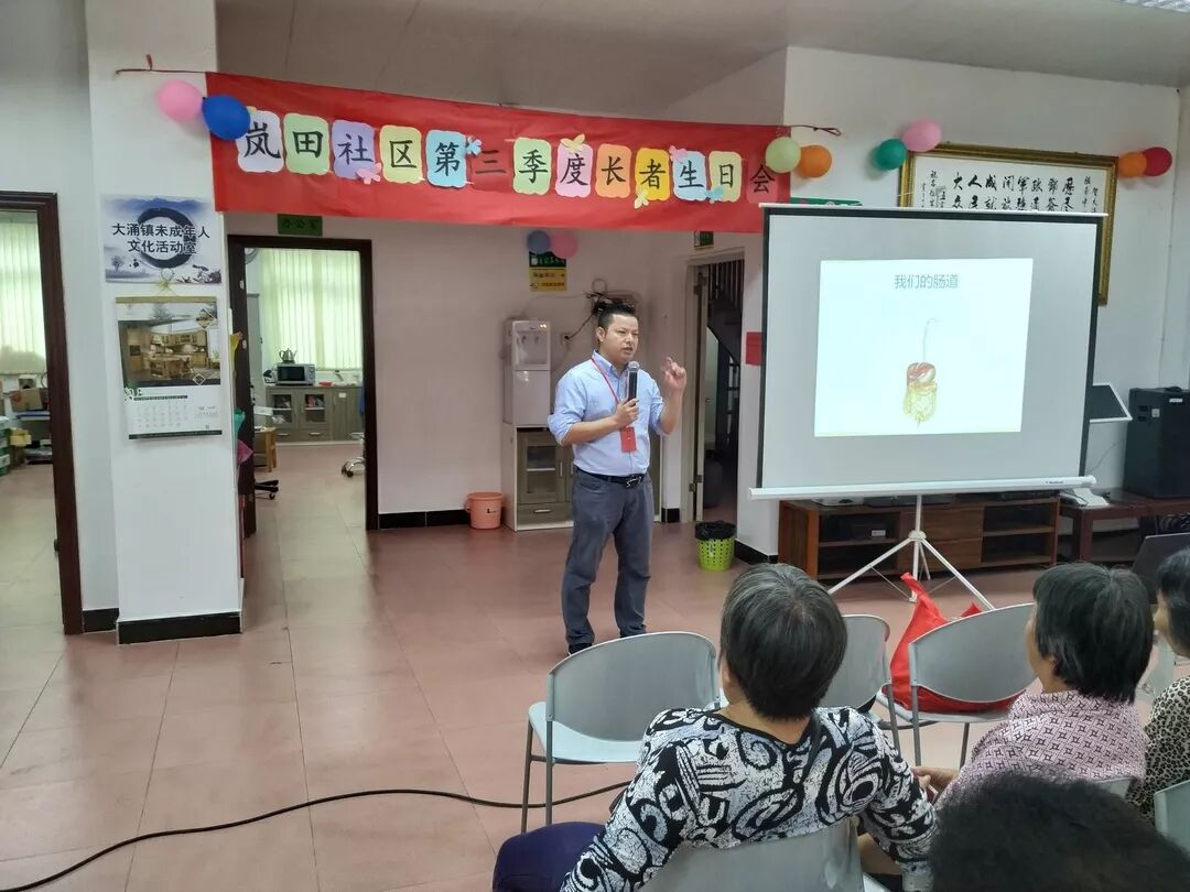 讲座结束后,生日会正式开始。志远社会工作服务社总干事贝荣满主持了生日会 贝总干事主持活动 由志远·大涌镇居家养老服务中心、广州益力多乳品有限公司以及中山农商银行大涌支行营业部的代表先后为老寿星们献上祝福致辞后,又一起为4位义工寿星代表送上生日帽、生日礼物和贺卡。紧接着,在场的长者和寿星一起唱生日歌、吹蜡烛、切蛋糕,场面既温馨又热闹。工作人员陆续为在座的长者送上蛋糕,满满的幸福甜蜜萦绕在现场。 寿星在切蛋糕 长者们许的是什么愿望? 切蛋糕 社工为长者送上礼物 领取活动奖品开心的长者 社工义工在派发生日礼物 活动的最后,所有参加的长者和工作人员一起合影留念,留下难忘的时刻。至此,岚田社区第三季度长者生日会圆满结束。 大合照 本次活动在向长者们普及肠道知识的同时,通过举办长者生日会等活动,向长者传递健康和心灵关爱,创造互动交流平台,让长者在社区内老有所为、老有所乐,让长者们获得尊严和成就感,更推动了更多社会力量参与老年公益事业的发展。