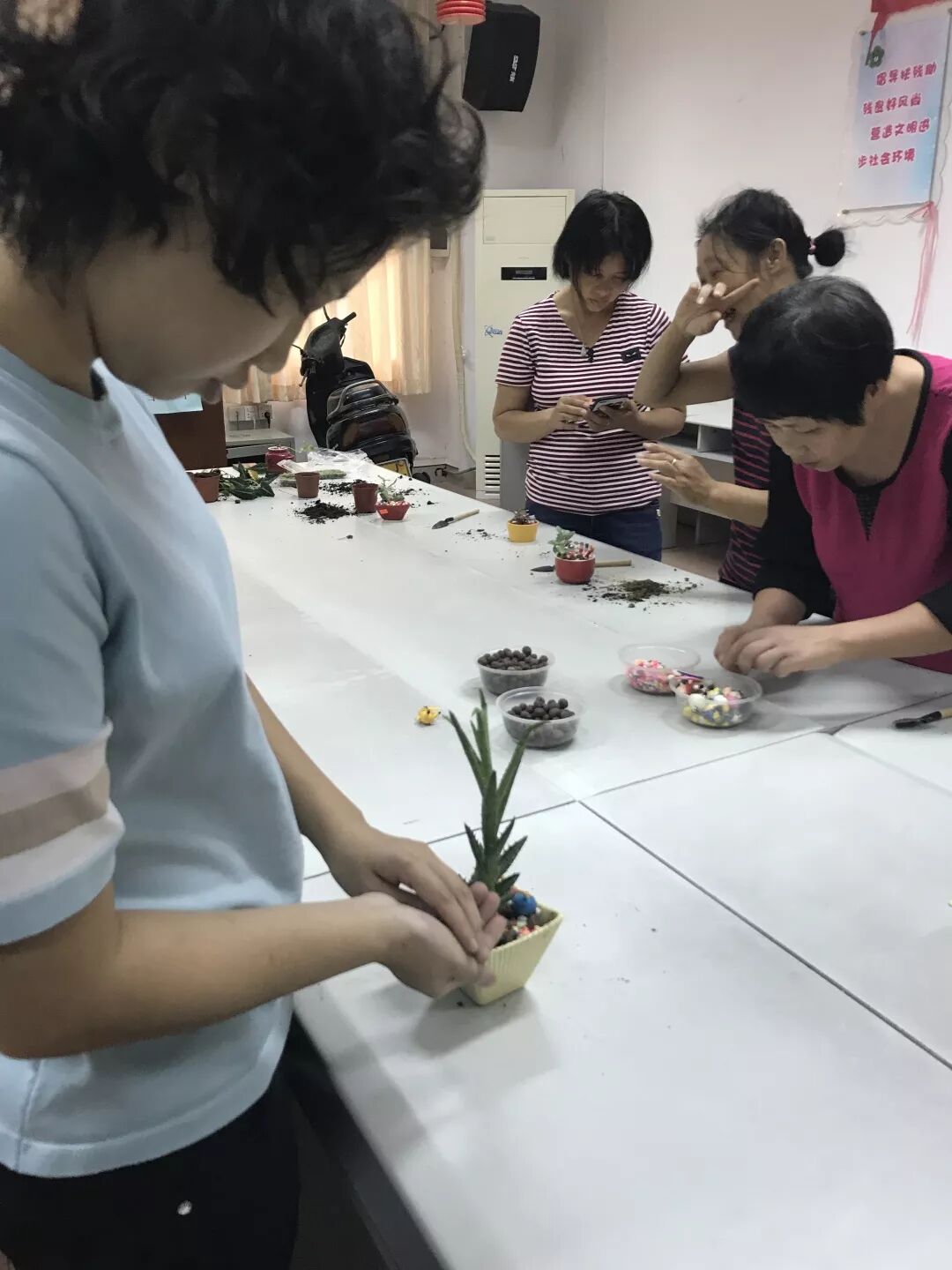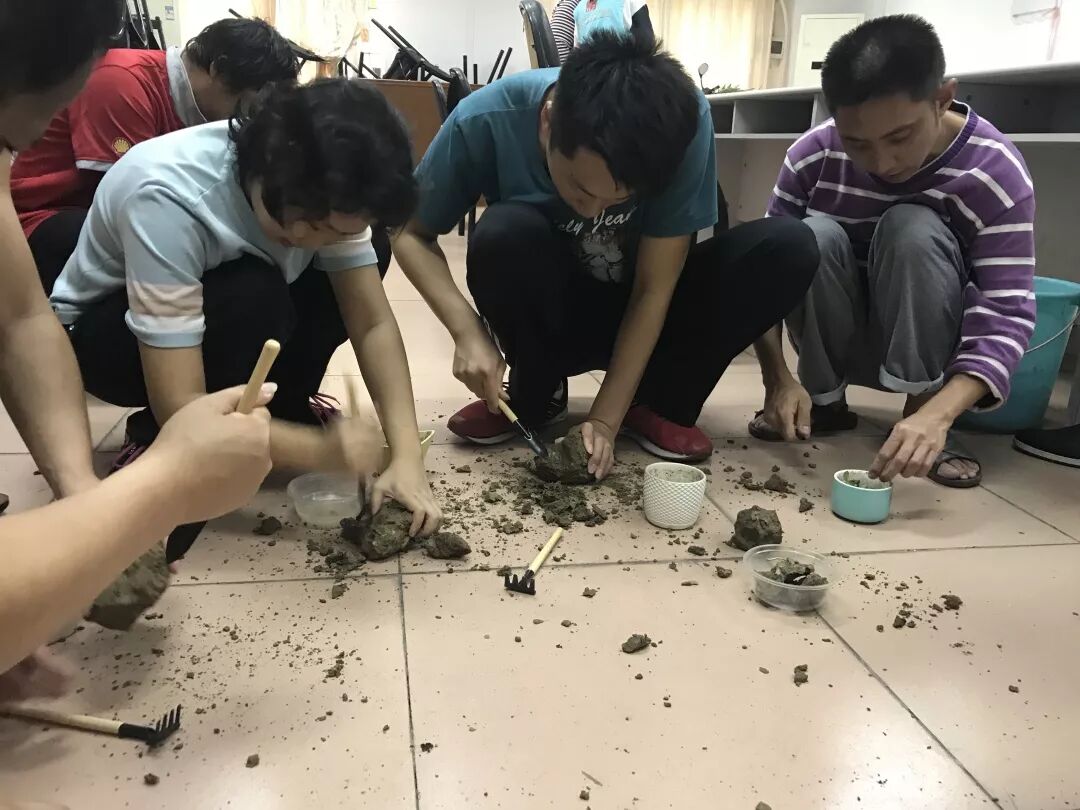 接下来就是自行种植盆栽的环节,先由社工解说种植材料并且告诉学员按照自己的想法种植,接着学员们捣泥、挑选植株、挑选花盆、种植、稍加装饰再到最后贴上自己的名字都是独立完成的。