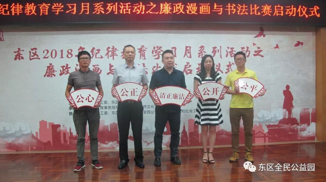 9月30日 为进一步推进廉政文化建设,大力弘扬中华优秀传统文化,加强“廉荣贪耻”的荣辱观教育,结合《东区2018年纪律教育学习月活动方案》要求,东区纪工委现在全区范围内开展2018年反腐倡廉漫画、书法比赛活动。通过广泛征集“反腐倡廉”主题的优秀廉政漫画及书法作品,向社会倡导廉洁文化,营造崇廉尚廉的良好社会氛围。 在9月30日上午, 由东区纪工委及东区文体教育局主办的“东区2018年纪律教育学习月系列活动之廉政漫画与书法比赛启动仪式” 于东区全民公益园A区顺利举办,现场参加人员共50余人,包括各主办单位、承办单位、协办单位的部门负责人;东区各社区纪委书记;东区各所中小学代表;有意参与比赛的企业代表及群众,更联动了7名博爱行动义工参与到本次活动的筹备与开展。 纪工委副书记、监察室主任石强为活动致辞,一来表达了对东区廉政文化建设的深切期望,二来希望各单位做好本次活动的相关工作,三是强调群众快乐参与、寓教于乐! 致辞 嘉宾上台,手持代表着反腐倡廉的活动标语,完成了启动仪式! “清正廉洁、公心、公正、公开、公平”,寓意着开展反腐倡廉工作秉承的思想,也是比赛过程中做到的“公心、公正、公开、公平”的保证! “东区2018年纪律教育学习月系列活动之廉政漫画与书法比赛”启动仪式至此圆满结束,接下来各单位会做好活动宣传、作品征集、评选、等工作,展现东区廉政教育成果,鼓励群众更多参与,“说”出心中廉。 报 2018年 名 详 扫我 情 本次作品征集时间为9月1日~10月30日,将结合大众网络评分及专家评分选出优胜作品,分别是一等奖、二等奖、三等奖、优秀奖、网络人气奖等,奖品丰富,获奖机会也是不小的哦。 如果你喜爱画画、练字,如果你要想说的廉洁故事,如果你想参加东区的廉政文化建设,就绝对不要错过啦,有意者可扫描上面二维码或点击阅读原文,查看参与规则哦! 主办单位 东区纪工委 东区文体教育局 承办单位 东区教育事务指导中心 广东悠然文化交流有限公司 协办单位 东区社工委 东区宣传办 东区全民公益园 中山市联和社会工作服务中心 点 阅读原文了解更多