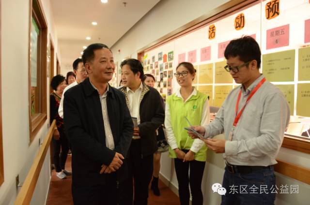 2016年11月3日上午,广东省民政厅党组成员、副厅长饶美奕,省民政厅社会福利和慈善事业处处长聂元松,省福利彩票中心主任黄严冰,程丽红等领导,在中山市民政局局长沈名晓陪同下,莅临东区全民公益园及东区居家养老服务中心参观指导。