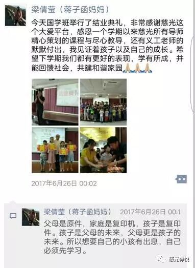 慈光-慈孝缘云思维+国学亲子班都是父母孩子共同学习成长的。通过国学、孝道等课程更加懂得“百善孝为先”。通过云思维的学习把互联网时代的思维方式应用到工作和生活中。子涵的妈妈提到自己平时和他爸爸也都是很善待员工的,子涵的爸爸是一位见义勇为的企业家,当看到别人有困难的时候他总是积极的站出来。自己也都是把员工当做亲人一样,爱护照顾他们。